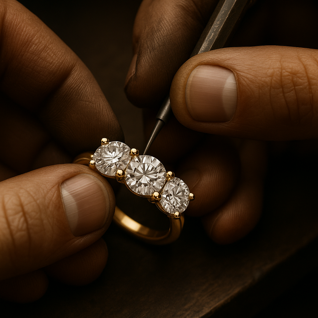 In this stage, skilled artisans carefully refine the cast piece by filing away imperfections and shaping it to perfection. Next, stones are meticulously set by hand, ensuring precision, security, and flawless alignment to bring the design to life.